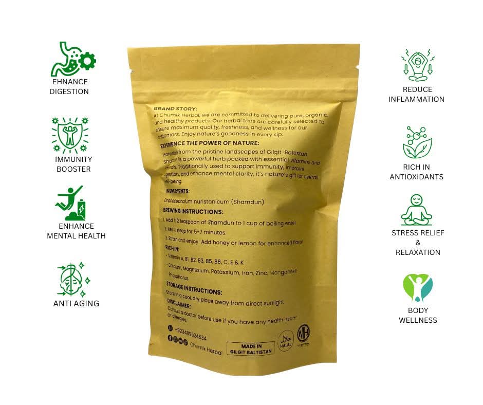 Reconnect with nature through Shamdun Herbal Tea — a rare, traditional wellness infusion sourced from the high-altitude meadows of Baltistan (3200–4000m). Crafted from the wild-harvested seeds of Dracocephalum nuristanicum, this Himalayan herbal tea is a time-honored remedy known for its powerful benefits in digestion, relaxation, and postpartum recovery.